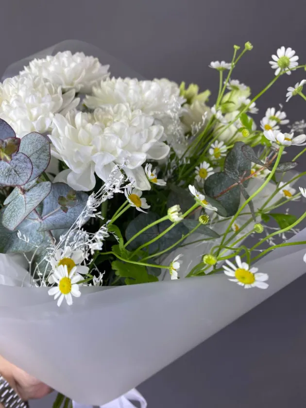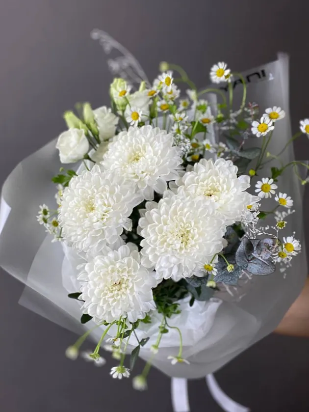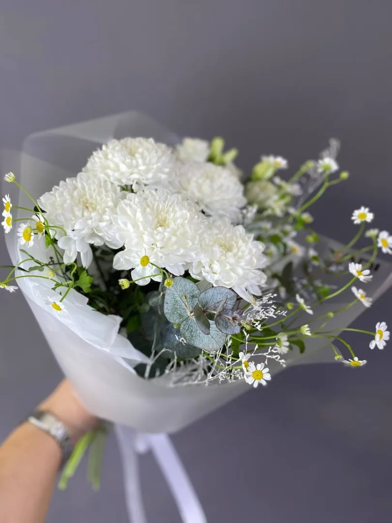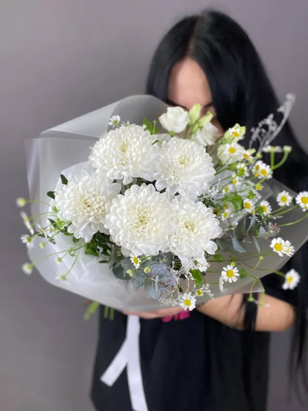 Этот изысканный букет состоит из одного цветка Алтай, одной ромашки Танацетум, двух эвкалиптовых веточек, одной эустомы, двух веточек декоративной зелени и двух сухоцветов. В комплекте также идет инструкция по уходу за цветами и средство для продления жизни букета.