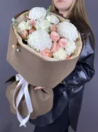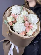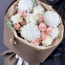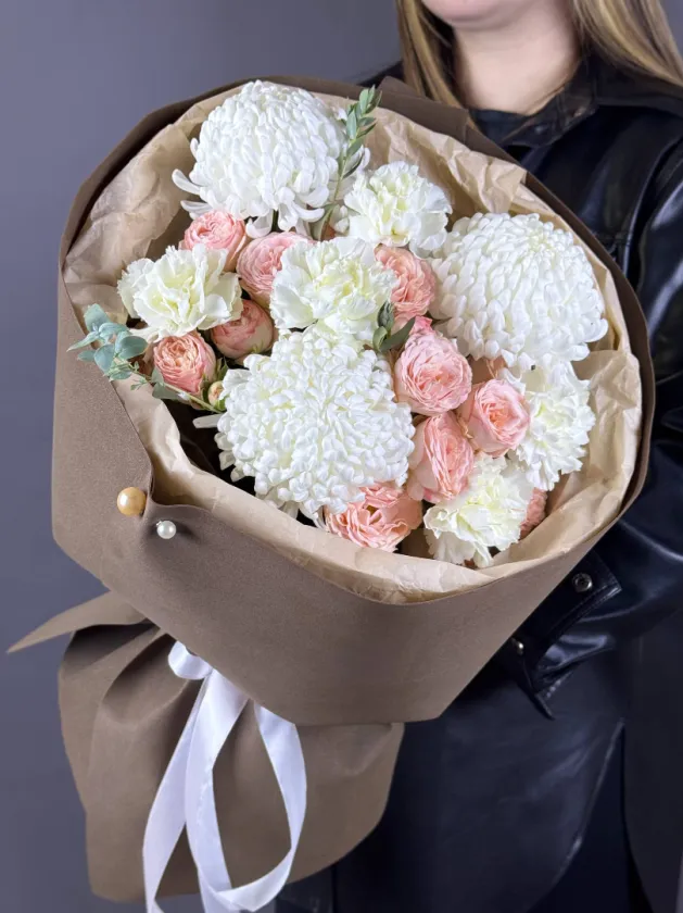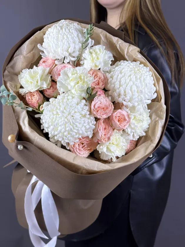 «Магия момента» — это изысканное сочетание свежих хризантем бигуди и нежных диантусов, розовых кустовых роз, которое подарит вашему дню особую атмосферу. кустовые розы с их мягкими розовыми оттенками, символизируют любовь и нежность, а белоснежные диантусы добавляют элегантности и утонченности.