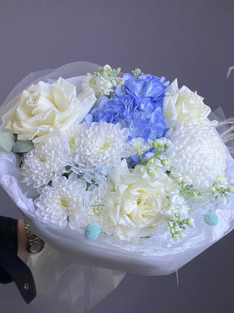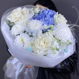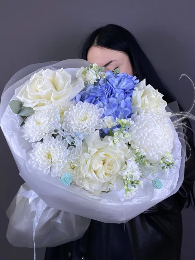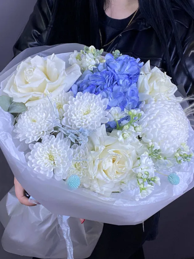 Познакомьтесь с утонченной воздушностью «Дуновение», где изысканно переплетаются розы, гортензии, хризантемы, маттиола, в нежной пастельной палитре. Это сочетание розового, белого и голубого оттенков создает ощущение легкости и романтики. Аккуратная упаковка добавляет букету элегантности, подчёркивая красоту каждого цветка.