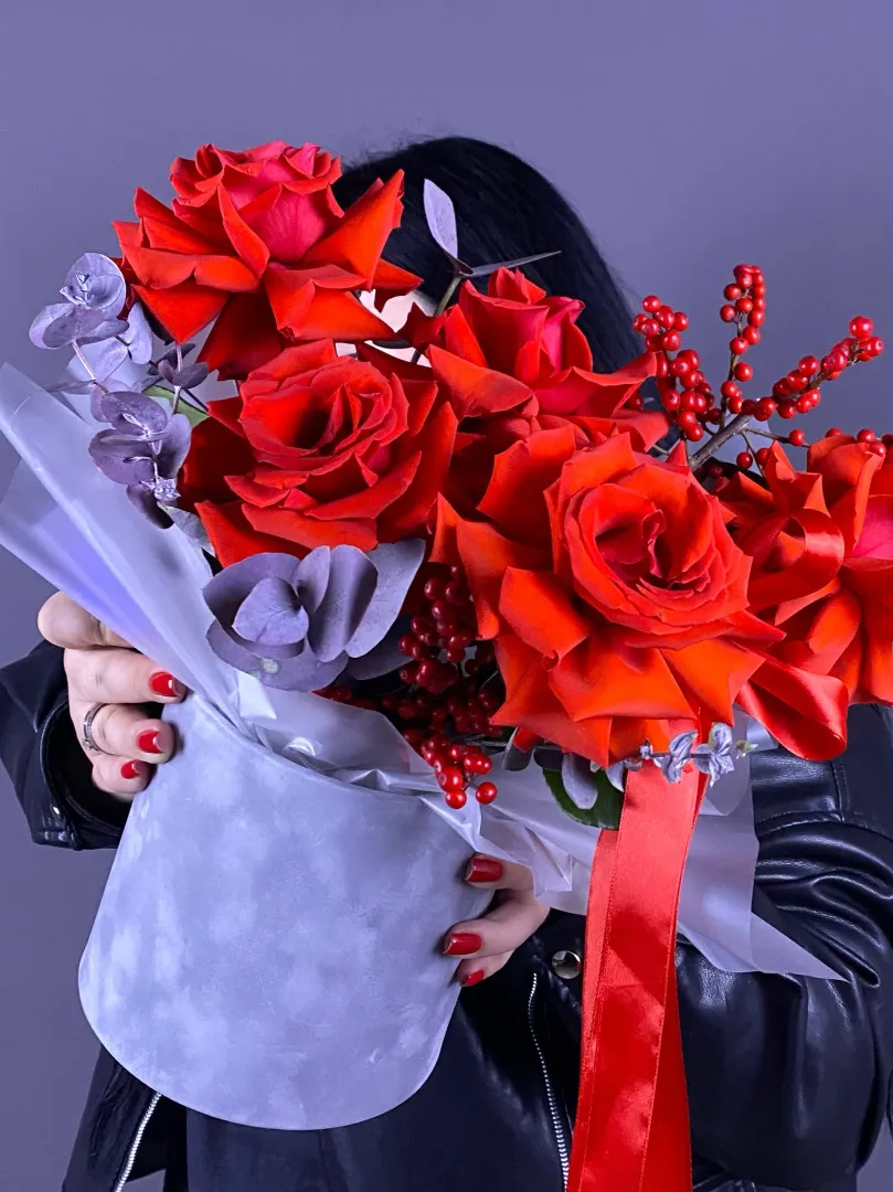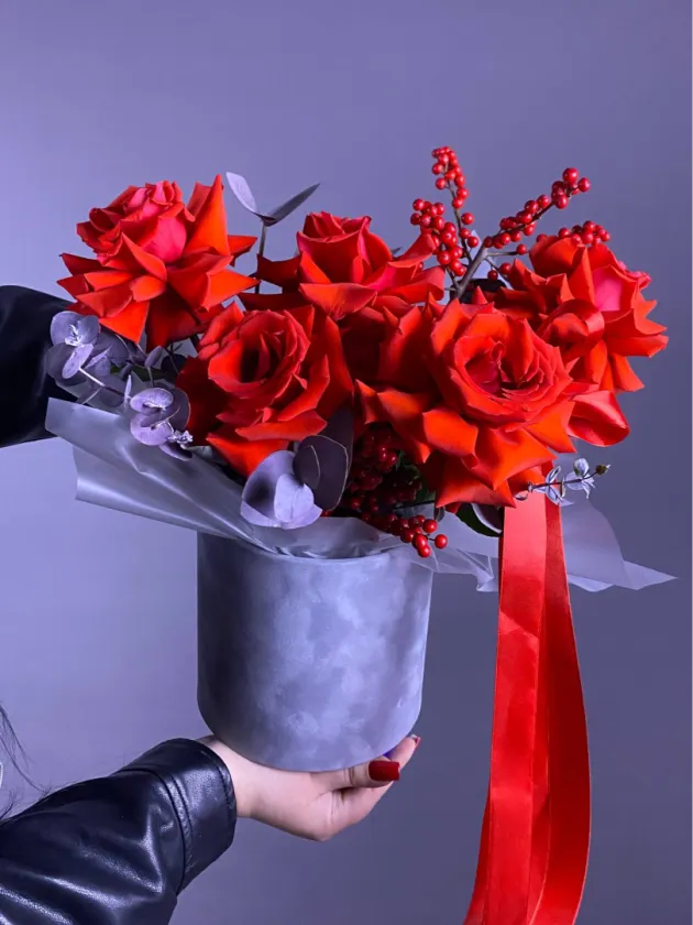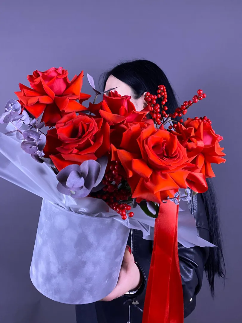 Композиция «Барбариска» — это сочетание французских роз, дополненных изящным илексом. Композиция выглядит элегантно и свежо. Эвкалипт добавляет композиции лёгкость и изящество.