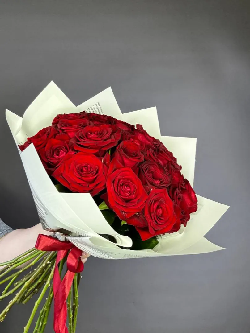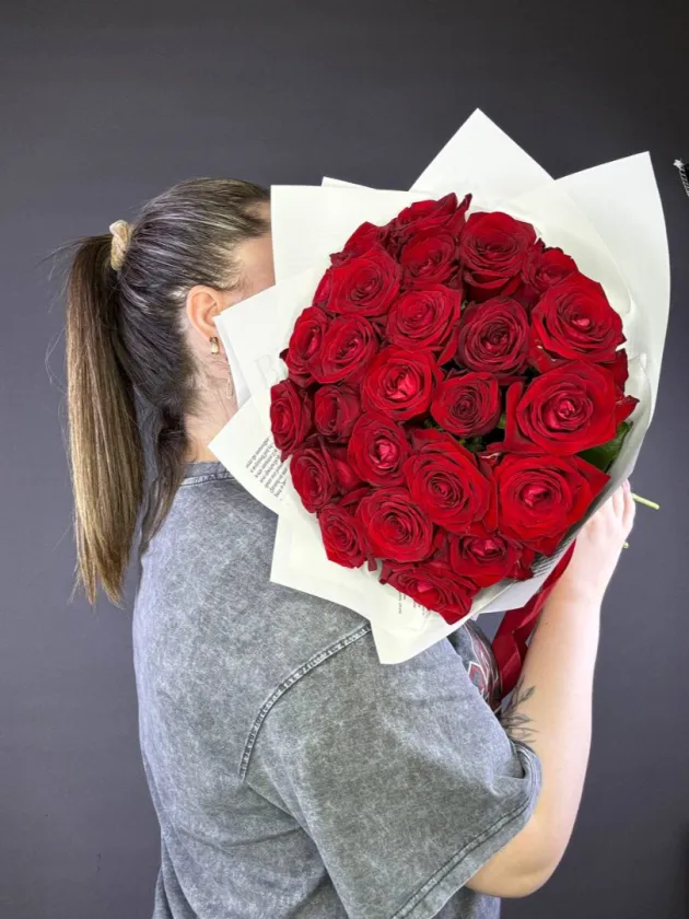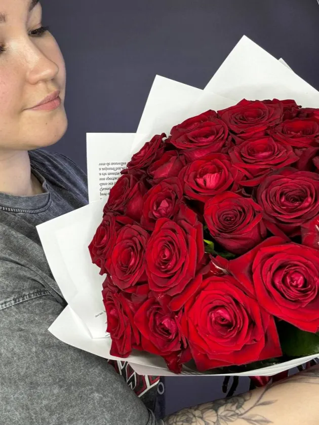 Эффектный букет из 25 благородных красных роз в оригинальной упаковке с газетным принтом - воплощение страсти и стиля. Стильная планка с винтажным принтом придает букету особый шарм и современность, а пышные розы создают впечатляющий объем. Идеальный выбор для тех, кто ценит элегантность и хочет произвести впечатление.