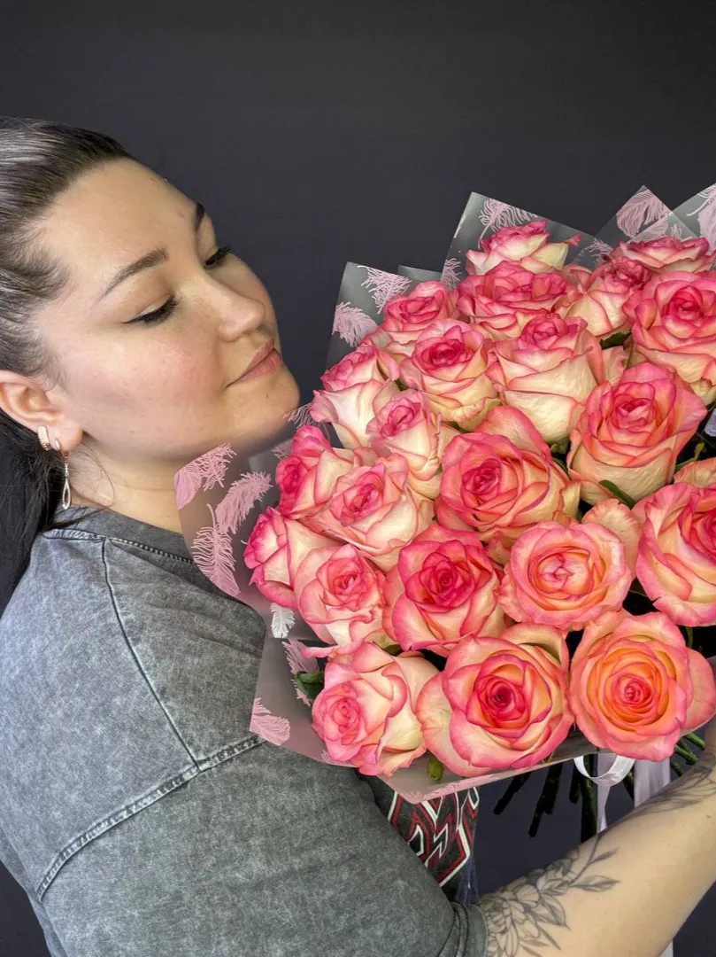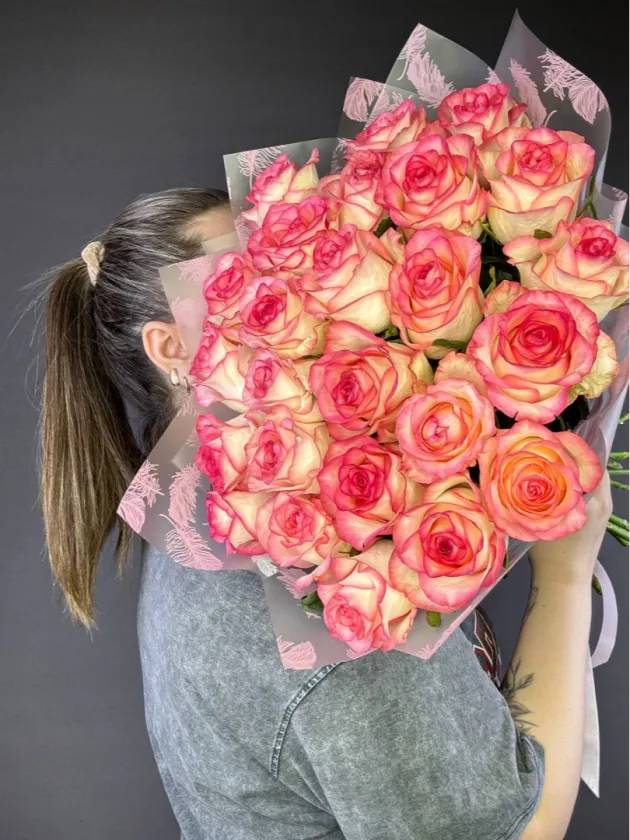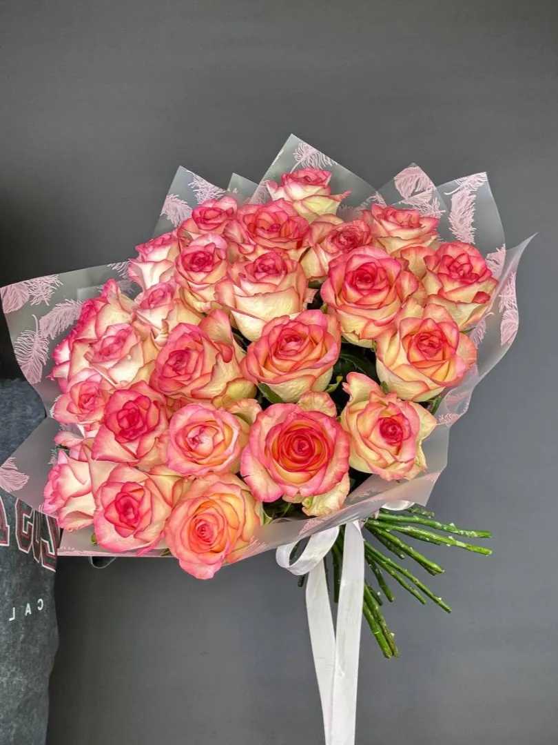 Роскошный букет из 25 роз в нежном розово-белом сочетании, искусно упакованный в современную матовую пленку с прозрачным розовым оттенком. Изысканный букет станет настоящим украшением любого события.
